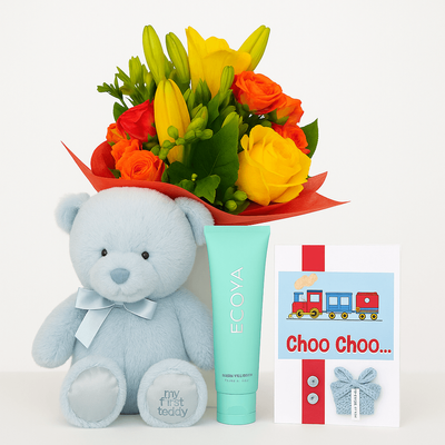 Welcome a beautiful baby boy with our My First Teddy Posy Gift Set – Blue, a thoughtful combination of freshness, softness, and luxury — perfect for new parents or hospital deliveries.