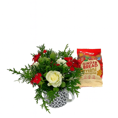 A festive mini arrangement featuring fresh Christmas greenery, bright red and classic whie, beautifully arranged in a reusable Enamel mug. Paired with a pack of Gingerbread Mini People for a sweet holiday treat — the perfect small Christmas gift for teachers, friends, neighbours, or the office