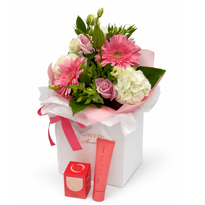 A beautifully presented gift bag featuring a fresh, feminine mix of soft coloured blooms, paired with luxurious Ecoya goodies for an extra special touch. This elegant arrangement includes seasonal flowers such as gerberas, roses, lilies, and complementary foliage.