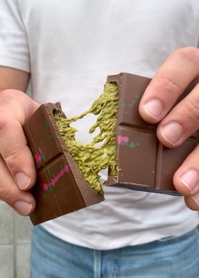 Indulge in the luxurious taste of Dubai-style Chocolate Pistachio Knafeh, where Premium 33% milk chocolate meets the crunch of golden-baked knafeh and the nutty goodness of premium pistachios. The pistachio filling contains 45% pistachio paste and does not contain palm oil, offering a rich, creamy, and natural nut flavor.